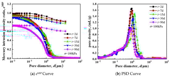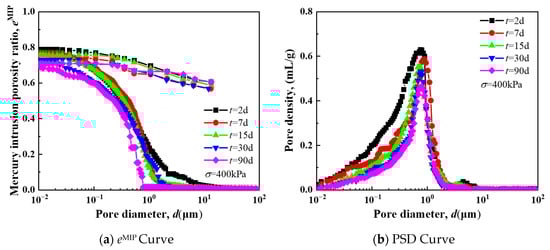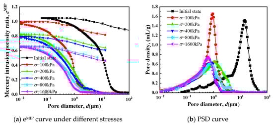 Figure 25a,b present the cumulative mercury intrusion porosity (eMIP) and pore size distribution (PSD) curves of remolded silt under different stress levels. The decreasing eMIP with increasing stress (Figure 25a) agrees with compression curves, validating the mercury intrusion tests. The PSD curves (Figure 25b) exhibit unimodal distributions, with peak pore diameters decreasing from 14.61 µm (0 kPa) to 0.64 µm (1600 kPa), accompanied by reduced peak densities. This shift indicates progressive compression of macropores (defined by peak diameters) under stress, confirming that soil compression primarily results from macropore collapse.