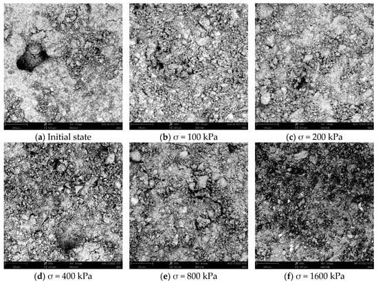 SEM (×500) photographs of remodeled soft soil at different stresses.