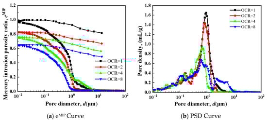 Figure 27 shows the eMIP and PSD curves under different OCRs. The decreasing eMIP with increasing OCR indicates denser particle packing and reduced porosity. All PSD curves exhibit unimodal distributions with minor peak variations, suggesting particle rearrangement and uniform microstructure. Notably, the decreasing peak pore density with higher OCR confirms reduced porosity and creep, consistent with macroscopic observations.