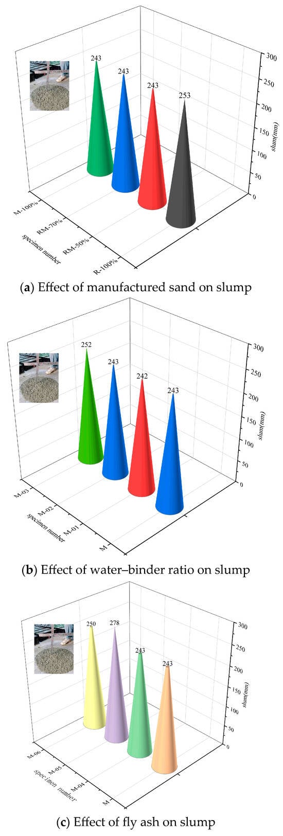 - An increase in manufactured sand content led to a reduction in concrete slump. Complete replacement of river sand (100%) resulted in a 4.0% decrease in slump. In contrast, the spread flow of concrete improved with elevated levels of manufactured sand and fly ash. Specifically, at a water-to-binder ratio of 0.3, a 9.7% increase in spread flow was observed.