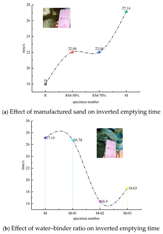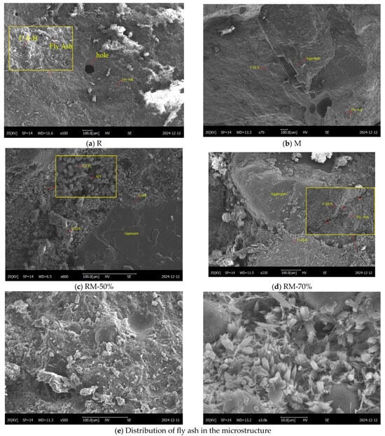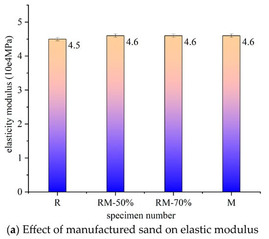 - The elastic modulus exhibited an increasing trend with higher manufactured sand replacement rates, lower water-to-binder ratios, and greater fly ash content. Nevertheless, the influence of the manufactured sand replacement rate on the elastic modulus was relatively minor. In comparison, both a reduced water-to-binder ratio and an elevated fly ash content significantly improved the elastic modulus, which reached a maximum 28-day value of 5.0 × 104 MPa.