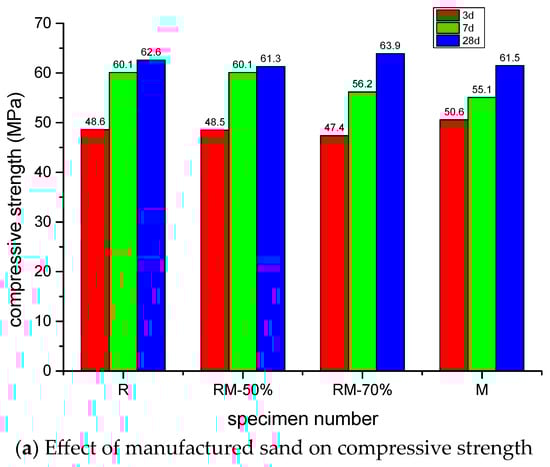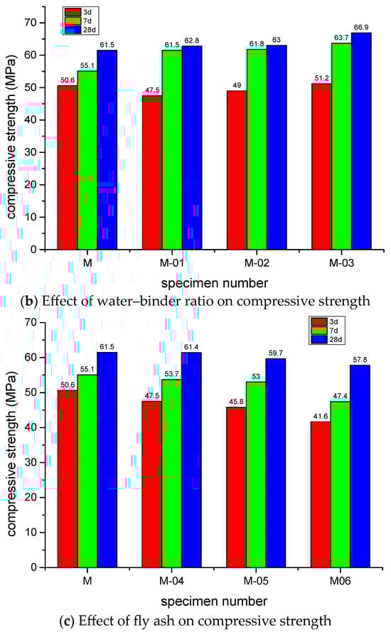 - The incorporation of manufactured sand contributed to an enhancement in the compressive strength of concrete, with the 28-day strength peaking at 63.9 MPa under a 70% replacement ratio. A reduction in the water-to-binder ratio further improved compressive performance, yielding a strength of 66.9 MPa at a ratio of 0.3. Conversely, an increase in fly ash content resulted in a decline in compressive strength, which measured 57.8 MPa at a 25% incorporation rate.