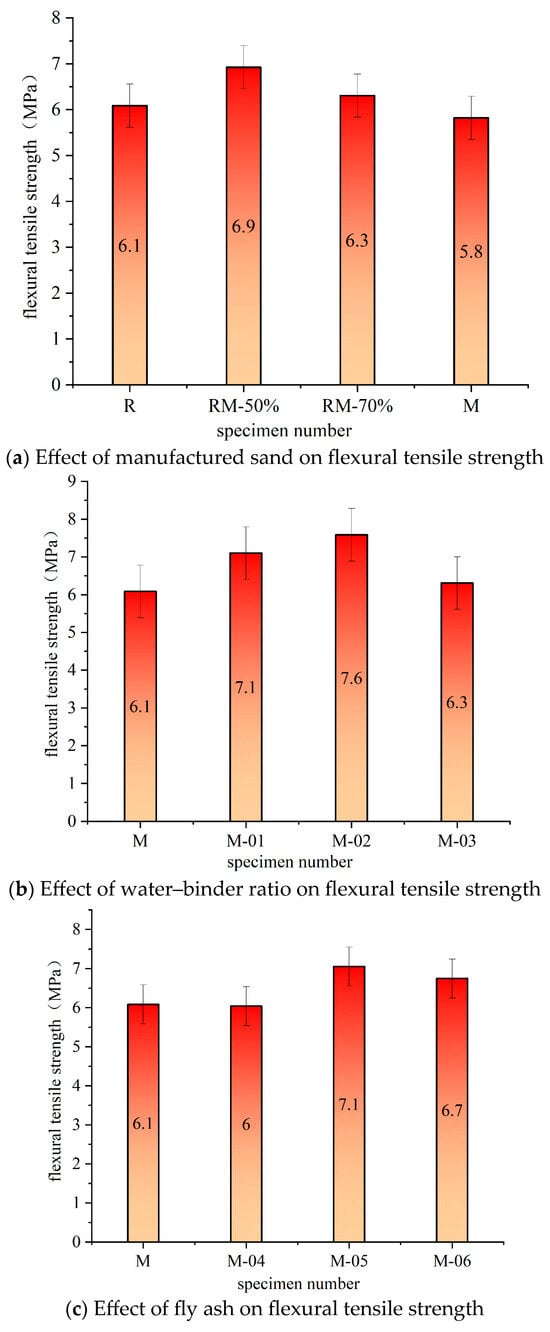 - The 28-day flexural strength of concrete reached an optimal value of 6.9 MPa with a 50% replacement of manufactured sand. A lower water-to-binder ratio further enhanced the flexural performance, achieving a peak strength of 7.6 MPa at a ratio of 0.31. Additionally, the maximum 28-day flexural strength observed with 20% fly ash content was 7.1 MPa.