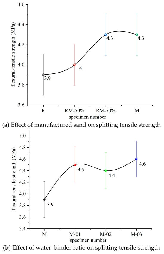 - The splitting tensile strength of concrete exhibited a positive correlation with the content of manufactured sand, peaking at 4.3 MPa with a 70% replacement rate. At a water-to-binder ratio of 0.3, the tensile strength reached its maximum value of 4.6 MPa. Furthermore, higher fly ash content also contributed to enhanced tensile performance, achieving a peak strength of 4.6 MPa at a 25% incorporation rate.