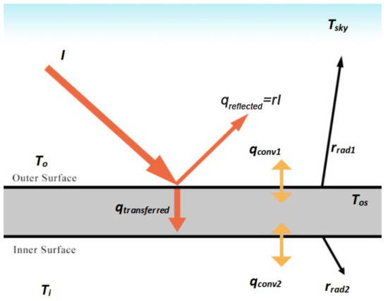 The thermal dynamics of building surfaces under solar radiation include the following heat fluxes (Figure 1): incident solar short-wave radiation (I), long-wave radiation exchange with sky (rrad1), the convective heat exchange with the outer atmosphere (qconv1), and the convective and radiative heat exchange with the indoor environment (qconv2, rrad2).