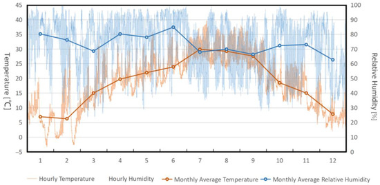 As shown in Figure 2, the climate data of 2024 obtained from the local weather station (about 1 km away from the investigated building) reveal some key characteristics. The monthly average relative humidity remains consistently above 60%. Temperatures exhibit remarkable seasonal fluctuations throughout the year. The hottest months (July, August and September) have monthly average temperatures over 25 °C, with maximum daily temperatures occasionally exceeding 35 °C. During the coldest period (December to February), monthly averages range from 5 °C to 10 °C, while the daily temperatures occasionally fall below 0 °C.