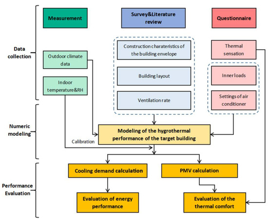 The research workflow of this study aims at a comprehensive assessment of the energy retrofit including the energy efficiency improvement and changes in indoor thermal comfort due to the application of reflective materials. For this purpose, this research is divided into three main steps: data collection, numerical modeling, and performance evaluation (Figure 6).