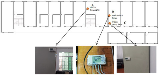 It is worth noting that ASHRAE 55 [37] recommends that the distance of measurement instruments for indoor air temperature and relative humidity not be less than 1 m from interior walls to avoid the possible influence of the radiation effect. In our study, the distance of measurement instrument A from the wall on the south side is about 40 cm. However, the interference caused by the surface radiation of the south inner wall is limited due to the following reasons.