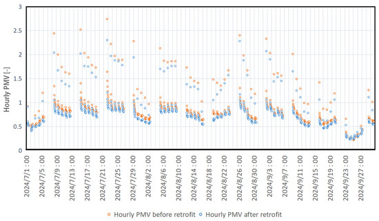 Considering the time-consuming process of questionnaires and operational constraints, the PMV is developed by Fanger [42]. The PMV predicts the average TSV of occupants in a given thermal environment. The PMV is calculated based on the following parameters: air temperature, mean radiant temperature (MRT), air speed, relative humidity, metabolic rate and clothing level. According to ASHRAE-55 [37], PMV values ranging from −0.5 to +0.5 are considered comfortable.