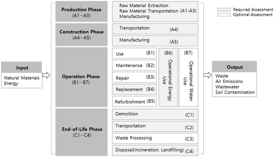 Building LCA is a standardized methodology for quantitatively evaluating the environmental impacts associated with a building throughout its entire life span. It follows the guidelines established by the International Organization for Standardization (ISO), specifically ISO 14040 and ISO 14044 [21,22]. ISO 14040 defines the overall principles and framework of life cycle assessment, outlining its four phases: goal and scope definition, life cycle inventory analysis, impact assessment, and interpretation. ISO 14044 complements this by specifying detailed requirements and procedures for each phase, including criteria for data quality, transparency, and consistency. Together, these standards ensure that LCAs are conducted in a scientifically rigorous and internationally comparable manner. By grounding this study in ISO standards, the results gain greater credibility and can be more readily applied to policy and practice both in South Korea and internationally.