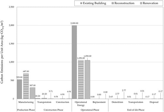 This study conducted LCAs for three scenarios—maintaining the existing structure, reconstruction, and renovation—to estimate their respective GWPs. Table 10 and Figure 2 present the detailed results.