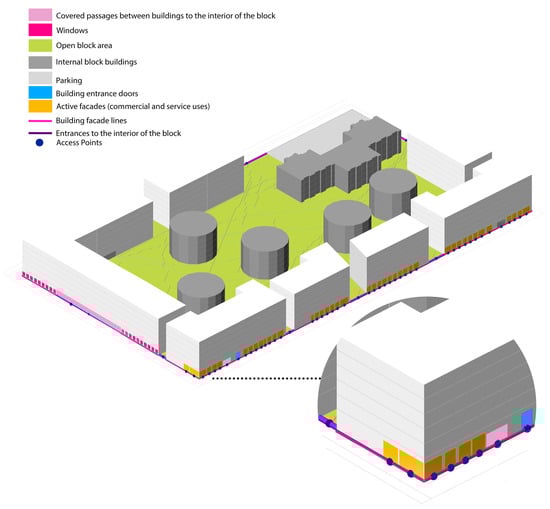 40], block perimeters exceeding 600 m tend to discourage walking, and it is recommended to create transversal connections that allow crossing through the interior of the block. Adu-McVie et al. [