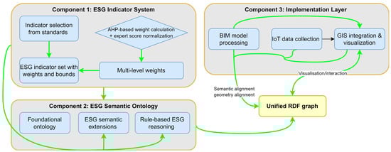 This section presents a three-component methodological framework designed to enable transparent, automated, and semantically driven ESG evaluation in the context of green cities. Component 1 establishes a green city-oriented ESG evaluation system tailored to the urban scale. Based on established international frameworks and local sustainability priorities, a structured set of ESG indicators is defined across environmental, social, and governance dimensions. These indicators are further quantified and weighted using a multi-criteria expert-informed mechanism, enabling composite ESG scores that are both interpretable and actionable for policymakers. Component 2 constructs an ESG-driven semantic ontology based on GIS–BIM–IoT integration. The ontology is structured into three layers: a foundational layer reusing standards such as CityGML, IFCOWL [], and SOSA/SSN []; an ESG-specific semantic extension layer; and a rule-based reasoning layer that enables automated computation of ESG indicators. This semantic backbone facilitates cross-domain interoperability and supports traceable, explainable indicator evaluation. Component 3 implements the data integration pipeline that enables real-time ESG assessment in a web-based spatial environment. Through the transformation of IFC models into RDF and glTF formats and the incorporation of real-time IoT sensor data via web APIs, spatial, semantic, and temporal data streams are unified. This ensures synchronized representation and interactive visualization of ESG indicators across urban spaces. Together, these three components form an intelligent, interoperable framework to support evidence-based ESG governance in green cities. Figure 1 illustrates the interactions among the three components.