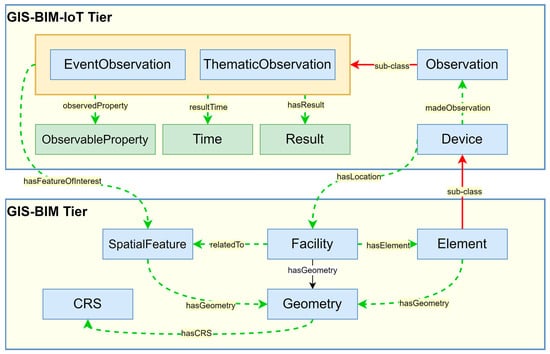 GIS-BIM-IoT integrated ontology (Green arrows represent object properties between different ontology classes. Red arrows denote class hierarchies (sub-class relationships)).