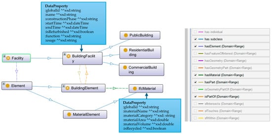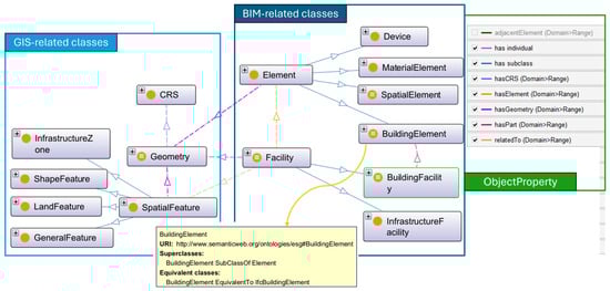 Ontology structure showing GIS- and BIM-related classes with key object properties (The URI shown in the figure, http://www.semanticweb.org/ontologies/esg#BuildingElement, was accessed on 17 September 2025).