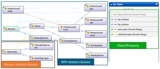On top of the static spatial semantic structure, real-time monitoring of green city operations is enabled through IoT integration. The ontology incorporates the BRICK schema and W3Cs SSN/SOSA ontologies to formally represent sensors, observations, and measurement results. As shown in Figure 4, the core class esg:Device, defined as a subclass of esg:Element, is further divided into esg:BuildingDevice and esg:InfrastructureDevice to reflect the physical deployment of sensing equipment across buildings and infrastructure systems. According to ESG evaluation needs, specific subclasses such as esg:Sensor, esg:Meter, and esg:Alarm are defined to support the monitoring of key domains, including air quality, energy use, water and waste management, traffic flow, and ICT infrastructure, across both building-level and city-scale environments. While the BRICK ontology provides detailed modeling of building subsystems and sensor control logic, the present ontology extends these concepts to a broader urban context. Device locations are modeled using brick:hasLocation. Devices associated with buildings are linked to corresponding esg:BuildingElement instances, while those deployed in public infrastructure are linked to esg:InfrastructureFacility. For example, a smart water meter used to monitor treated water is located within an esg:WaterUtilityFacility.