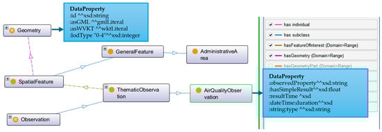 - Environmental QualityIncludes indicators such as PM2.5, NO2 concentration, air quality compliance rate, green space area, and green roof coverage. As shown in Figure 5, Pollutant concentrations are modeled using esg:AirQualityObservation, connected to specific pollutants via sosa:observedProperty. Spatial indicators such as green areas and roofs are represented using subclasses of esg:LandFeature, with geometry defined via geosparql:hasGeometry and resolution specified by esg:lodType.