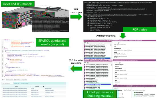 The process begins with the formalization of RDF reasoning rules tailored to specific ESG indicators. These rules are defined based on the classes and properties of the ontology and expressed using SPARQL CONSTRUCT queries, SHACL rule sets, or OWL reasoning profiles. The rules cover various logic types, such as quantity aggregation, conditional filtering, entity membership, and temporal constraints, allowing the derivation of indicator values from diverse sources, including sensor observations, building information, and governance records. To enable automated ESG indicator evaluation, this framework establishes a link between the nature of each data source, GIS, BIM, and IoT, and the types of sustainability attributes they are inherently suited to represent. GIS data, which captures the physical layout, zoning, and administrative structure of the city, provides essential context for indicators that are spatially distributed or population dependent. For example, indicators such as green space per capita, housing density, and access to mobility infrastructure depend not only on total quantities but also on their distribution across urban areas, which GIS systems can effectively express. BIM encodes detailed design, material, and performance-related information at the building or asset level. It offers a high-resolution foundation for evaluating construction-based indicators such as embodied carbon, material reuse ratio, and compliance with green building certifications. These indicators require access to material types, volumetric quantities, and spatial hierarchies, all of which are explicitly represented in IFC-based BIM models and can be semantically mapped through the ontology. IoT sensor data enables dynamic monitoring of urban conditions and operational performance. Indicators such as air pollutant levels, energy consumption, noise pollution, and water usage are inherently time-sensitive and cannot be inferred from static sources. IoT observations provide the necessary temporal granularity to assess how real-world environmental conditions evolve and influence sustainability goals. By aligning data modalities with the conceptual semantics of ESG indicators, the framework ensures that each indicator is grounded in a logically consistent data source. Each indicator is then operationalized through semantic reasoning rules that extract, transform, and evaluate the relevant fields to generate normalized, explainable, and interoperable ESG scores.