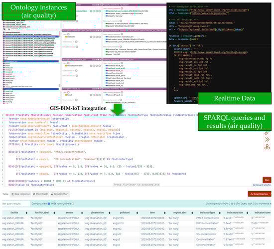 However, as indicated by Liu et al. [], the conversion between CityGML and IFC causes semantics loss and geometry mis-translation due to their distinct properties. In addition, while these approaches focus mainly on object-level or building-level coordination, they fall short of supporting city-scale semantic modeling, which is essential for ESG-informed policy-making. Here, semantic modeling at the city scale refers to representing heterogeneous urban data, such as buildings, infrastructure, public assets, and sensor observations, within a coherent structure that preserves meaning across domains and scales. Shi et al. [] proposed an ontology-driven methodology to form a semantically rich City Information Model (CIM), which harmonizes urban data by structuring it into hierarchical classes like Facility, Element, and Feature, which encapsulate buildings, infrastructures, and public assets with semantic coherence across different Levels of Detail (LoDs). Apart from GIS and BIM data, the integration of dynamic IoT data are surveyed by Tang et al. [] and Isikdag []. IoT data, ranging from air quality sensors to occupancy and energy consumption logs, are not treated as supplementary layers but are semantically integrated via Brick and SSN/SOSA ontologies. These ontologies semantically associate real-time observations with physical and logical entities defined in the ontology structure, thereby enabling continuous tracking of ESG-related indicators such as carbon emissions, thermal comfort, and urban heat island effects. This enriched semantic model allows stakeholders to conduct cross-scale ESG queries, simulate policy impacts, and derive actionable intelligence for sustainable urban governance. Furthermore, most urban DT implementations are not designed with ESG as a first-order requirement. ESG-specific assets and records such as water-quality monitoring stations, ICT service performance, permitting logs, and procurement records are often not defined as first-class entities at design time and are therefore omitted from the scope of the twin. As a result, important evidence streams for ESG oversight are difficult to integrate and hard to query across domains.