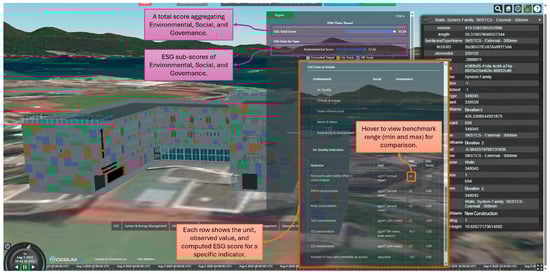 Multi-scale visualization capabilities are implemented through a Cesium-based 3D web interface that links ESG indicators to physical urban elements. Users are able to drill down from districts to buildings and components and inspect underlying evidence through interactive interfaces. Compared with static dashboards or tabular scorecards, this visual representation provides a more intuitive understanding of ESG drivers and supports actionable insights for planners and decision-makers.