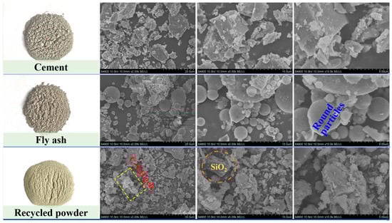 - The recycled powder exhibits an irregular microstructure, with large particles frequently covered by smaller adhered particles. Its median particle size is larger than that of both cement and fly ash, indicating a coarser particle size distribution. Mineralogical analysis reveals the presence of C-S-H gel along with a significant amount of inert components such as SiO2 and CaCO3. When used as a partial replacement for cement, the microstructure of the cementitious matrix gradually deteriorates.