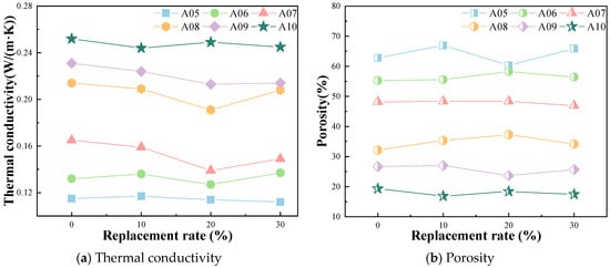 - The incorporation of recycled powder effectively mitigates the drying shrinkage of foamed concrete, with shrinkage progressively decreasing as the replacement ratio increases. Notably, high-density recycled powder foamed concrete demonstrates enhanced resistance to shrinkage. Furthermore, the addition of recycled powder exerts a limited influence on both the porosity and thermal conductivity of foamed concrete, indicating good compatibility regarding thermal performance and pore structure stability.