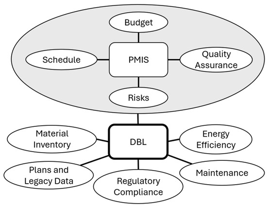 Another invaluable repository of information in the AEC sector is project management information systems (PMIS). Various systems and software have been proposed and developed for the objective of information management throughout the design and construction of buildings [14]. DBLs differ from PMIS in various aspects. Primarily, DBLs are intended to encompass the entire building life-cycle, including the operational phase, whereas PMIS focus on the managerial aspects during design and construction. Nevertheless, the two are not mutually exclusive; PMIS can be integrated into a DBL, to provide a comprehensive record, as illustrated in Figure 1. However, achieving this integration is complex due to the significant variability and often unstructured nature of data across different PMIS platforms and project-specific implementations.