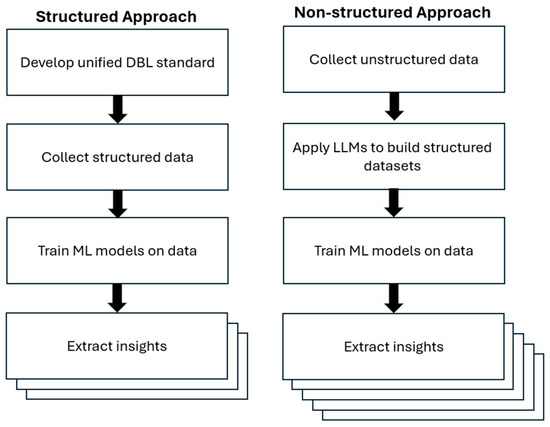 Many of the challenges in implementing DBLs parallel those in healthcare with EHRs, where inconsistent formats, unstructured notes, and persistent difficulties in achieving standardization leave critical information locked in non-standardized records [37]. Recently, the advent of LLMs has opened a new path to integrate these records. In a recent study on health data interoperability, researchers found that LLMs could bridge different data formats and convert them into easily understandable formats, greatly reducing the need for time-consuming standardization. A study by [24,25,38] has demonstrated that an AI could take free-form clinical notes from various sources and harmonize them. Similarly, ref. [39] leveraged an LLM to analyze unstructured EHRs for improving diagnostic accuracy, as well as reducing the time and cost of clinical visits. These results are highly relevant to DBLs, suggesting that the slow work of agreeing on every data field could be sidestepped by using LLMs to do on-demand standardization.