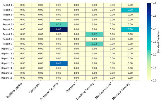 As shown in Figure 4, Boolean fields (Corrosion?, Cracking?, Moisture Issues?) were perfectly consistent across all runs (σ = 0), confirming the model’s reliability in detecting binary conditions. Minor variability appeared only in a few ordinal severity fields (σ ≤ 0.6), typically between adjacent values (e.g., 2 and 3), indicating interpretive flexibility rather than true inconsistency. Overall, the results show high repeatability in structured outputs, especially for deterministic fields, supporting the pipeline’s suitability for consistent DBL data extraction.