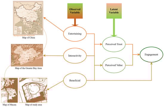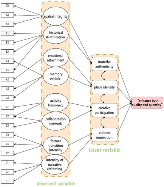 In recent years, SEM analysis has shown unique advantages in architectural research. Compared with traditional regression models, SEM can simultaneously handle obvious variables (such as spatial scale and material type) and latent variables (such as place identity and cultural perception), effectively controlling measurement errors through the separation of measurement and structural models []. In the field of cultural heritage, Chen and Rahman (2018) applied SEM to the perception of visitors in historic districts for the first time, and confirmed that “spatial readability” indirectly affects consumption intention through “emotional attachment” (indirect effect β = 0.24) []. This achievement has inspired subsequent studies to quantitatively explore the interaction mechanism of “human-environment”, such as revealing the reinforcing effect of “nostalgic narrative” on community belonging within the context of industrial heritage transformation, analyzed through SEM (path coefficient β = 0.51) [].