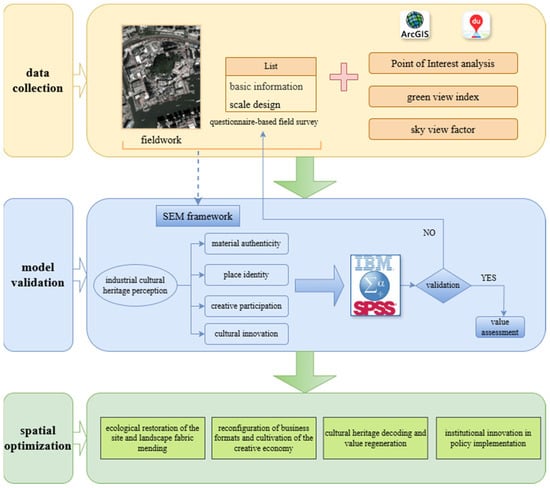 This study employs a sequential explanatory mixed-methods approach to systematically investigate the mechanisms of creative perception and regeneration in industrial heritage sites. The research integrates quantitative modeling (structural equation modeling, SEM) and spatial analysis techniques (Geographic Information Systems, GIS) into a comprehensive framework comprising three interconnected modules: data acquisition, model validation and spatial optimization. Fieldwork was conducted to collect multi-source data, including survey responses on latent variables such as material authenticity and place identity, as well as spatial data such as points of interest (POIs) and street-view imagery (used to calculate the Green View Index and the Sky View Factor). These data were georeferenced and integrated within an ArtGIS platform for subsequent analysis.