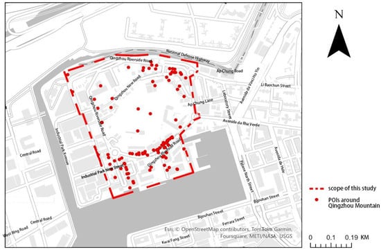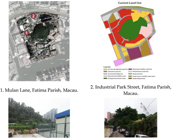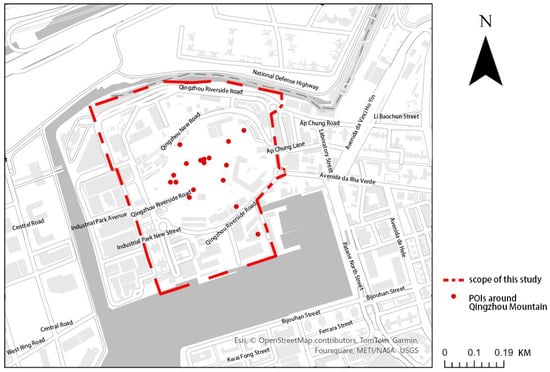 This study focuses on the Qingzhou Mountain area in the northern part of the Macao Special Administrative Region (Figure 3). It is adjacent to Qingzhou Riverside Road in the north, Chopstick Kei North Bay in the south, cross-border industrial zone in the west, and Avenida do Qingzhou (New Road) and Avenida Qingzhou in the east. The total area of the study area is about 238,000 m2 (about 23.8 ha). As a concentration area of historical industrial relics in the northern part of the Macao Peninsula, the surrounding environment of Ilha Verde presents a unique characteristic of spatial–temporal overlap. The core composition of the area is the main body of Qingzhou Mountain, which itself belongs to the “non-urbanization area” and contains a number of statutory cultural relics and places.