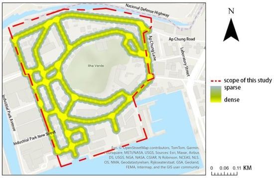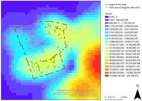 The density analysis function of ArcGIS was used to perform the nuclear density analysis of all points of interest, and the density analysis map of the POIs within the study area of Mount Qingzhou was obtained (Figure 5). It can be seen that most points of interest within the study area of Qingzhou Mountain are concentrated in the northeast corner (Qingzhou New Road) and the south side (Qingzhou Riverside Road), which aligns with the distribution of residential areas in the current land use map shown in Figure 3. Although the southeast side is relatively attractive within the study area, its level of attractiveness remains lower compared to the adjacent Chopstick Base and other areas.