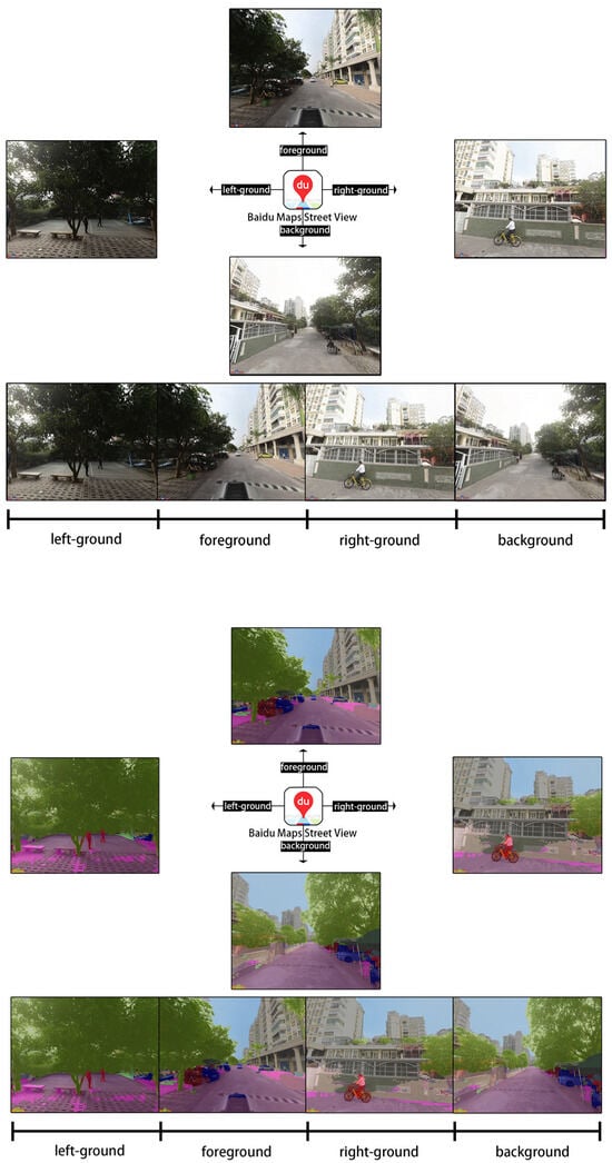 The green visibility of the street view photos in the four directions of the observation point was calculated (as shown in Figure 9), and then the arithmetic average was calculated to obtain the green visibility value of the observation point. The same steps were used to calculate the green view rate for street view photos of other observation points. Using the Baidu Street View Map API, panoramic images in four directions of 0°, 90°, 180° and 270° at each sampling point were systematically collected to form a multi-perspective image library, resulting in a total of 1532 images collected.