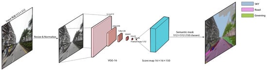 This study implements an FCN fully convolutional network on the ADE20K dataset: input images are isotropically resized to 512 × 512 and ImageNet-normalized, an encoder extracts 1/32-resolution features, a 1 × 1 convolution projects these into coarse 150-class semantic maps, and skip connections combined with 8× bilinear up sampling restore spatial detail, yielding pixel-level semantic predictions at the original image resolution (see Figure 10).
