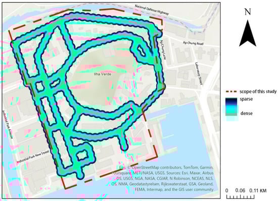 The land surrounding Qingzhou Mountain is mainly undeveloped, consisting mostly of shantytowns and auto repair workshops, and a large amount of industrial equipment and raw material is either stored or discarded, which stands in stark contrast to the natural environment of Qingzhou Mountain. The development of the region faces many challenges: lack of green space and public space, inadequate road connectivity and an urgent need to improve environmental quality. These current situations constitute the practical foundation for this study’s exploration of the creative perception and activation strategies of industrial heritage. The area centers on industrial heritage dating from the late 19th century to the middle of the 20th century, and the relics of the old shipyard, concrete water tank facilities, and red brick workshops are relatively intact, vividly recording the technical context and aesthetic characteristics of Macao’s modern industrialization. Despite the problem of modern architectural interspersion, the overall texture of the industrial heritage complex is still clearly identifiable, and some factories have a stable structure and a spatial scale suitable for transformation and utilization. Although the street space is fragmented, there are still traces of the historical path and the original flow of industrial production, and the axis relationship between the old shipyard and the storage area retains the spatial narrative foundation of the industrial scene. The vegetation cover is sparse, but the existing native tree species show strong adaptability, and the degree of heavy metal pollution in the soil is controllable, indicating potential for ecological restoration. The survey revealed that although the residents exhibit a spontaneous a sense of protective awareness, they lack the practical means to implement conservation measures. In general, the area surrounding Qingzhou Mountain not only faces challenges such as clutter and ecological brittleness, but also presents opportunities for industrial heritage revitalization, the reconstruction of historical memory and the cultivation of community resilience. The field survey results show that there are two public activity squares in the Qingzhou Hill area (one near Qingzhou New Road and the other on the south side of Qingzhou Riverside Road), with a total length of 1.8 km.