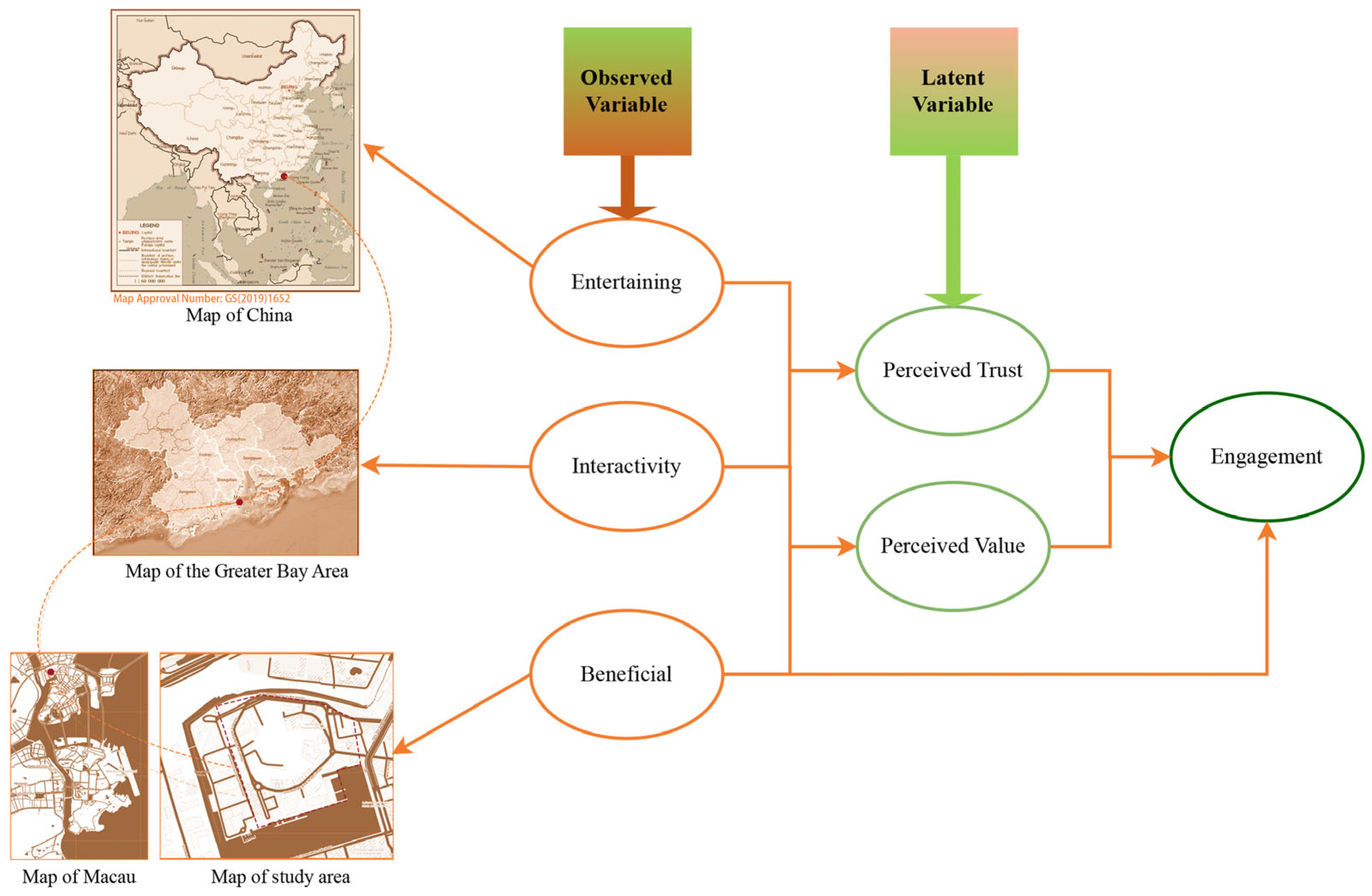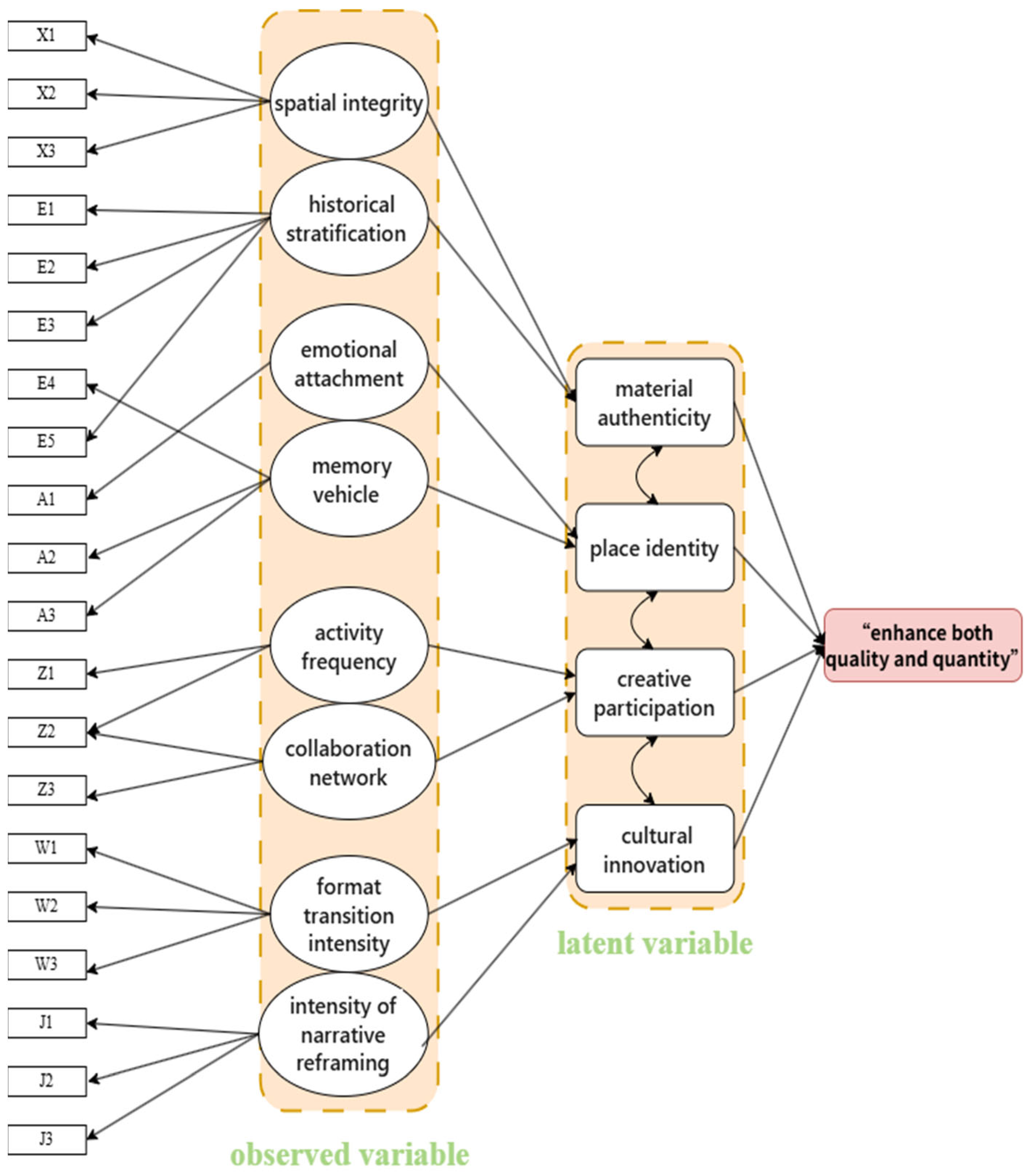 According to the structural logic of the SEM model and the design principles of the variable system, the density of activity venues (POI density), the green visibility rate, and sky visibility should be classified as observed variables (measurement indicators) under the latent construct of “Perceived Environmental Quality” in the variable system presented in