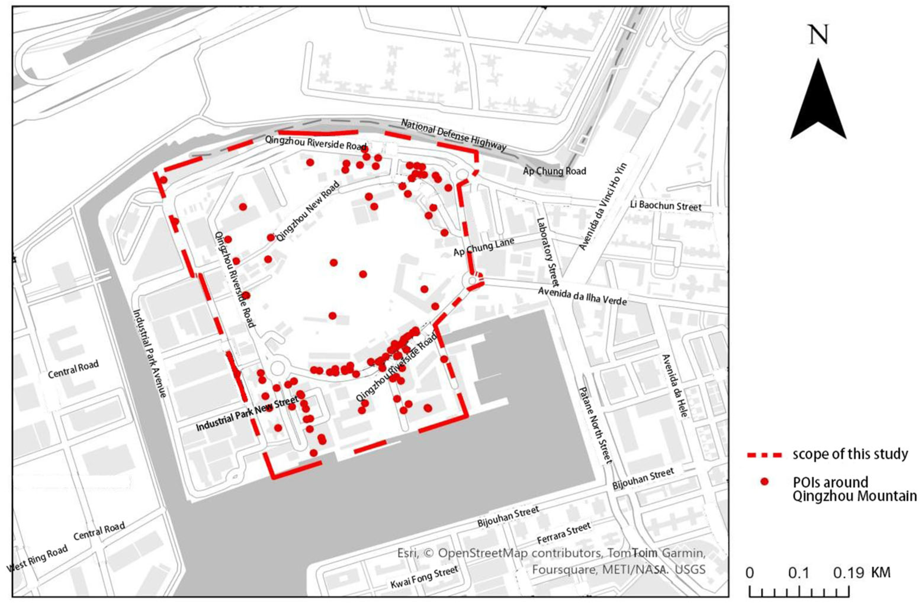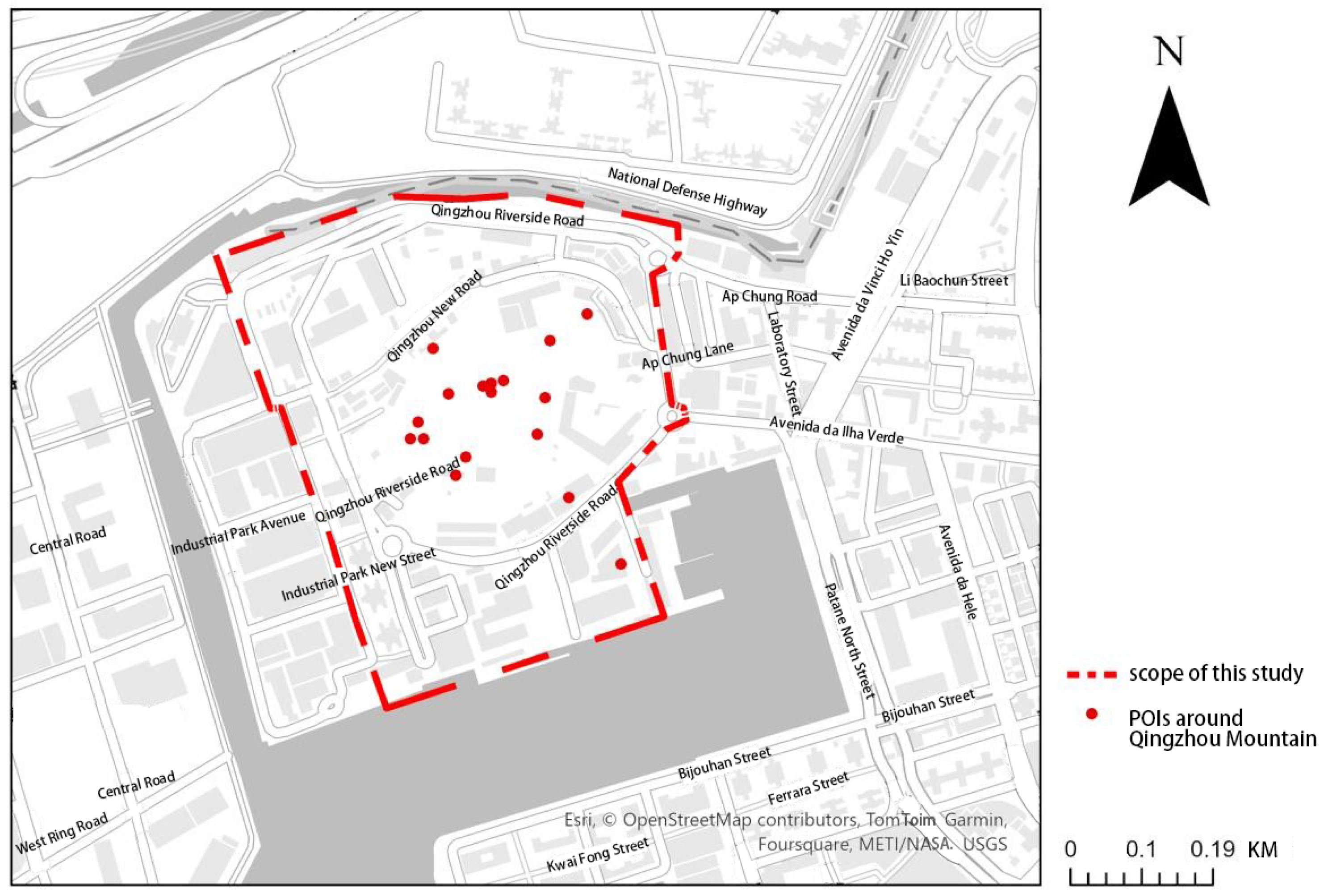 Figure 5). It can be seen that most points of interest within the study area of Qingzhou Mountain are concentrated in the northeast corner (Qingzhou New Road) and the south side (Qingzhou Riverside Road), which aligns with the distribution of residential areas in the current land use map shown in