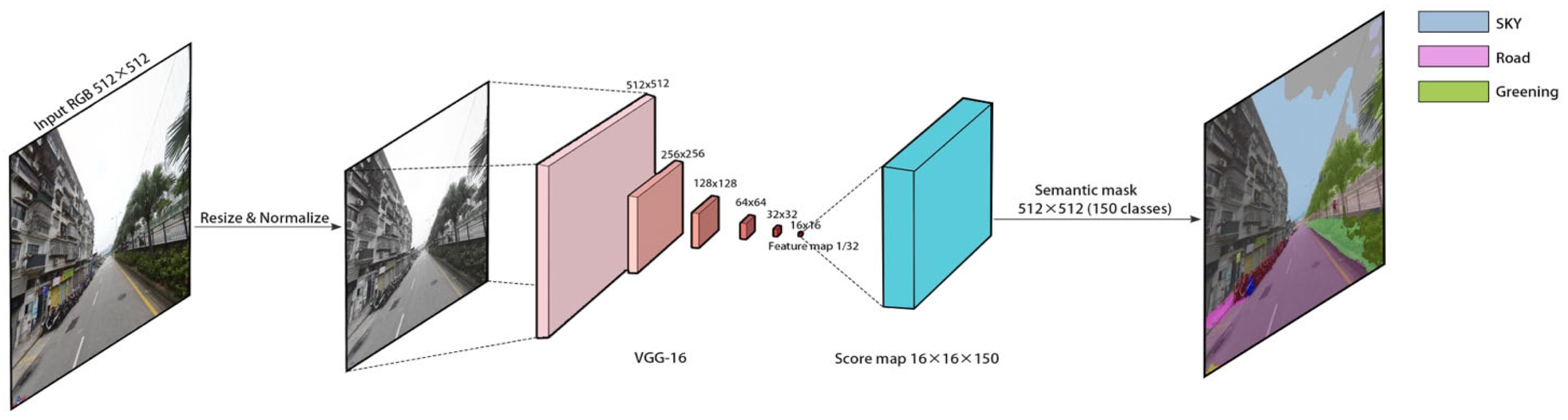 The image processing adopts a fully convolutional network (FCN) model based on the ADE20K dataset pre-trained to perform pixel-level semantic segmentation on the input image and identify 150 types of feature categories. Before model inference, the original image is normalized and calibrated (uniformly scaled to 512 × 512 pixels), and the segmentation results are output in 16 bit grayscale PNG format. The pixel values correspond to specific feature encoding, and a CSV file is synchronously generated to record the pixel proportion of various features in each image.