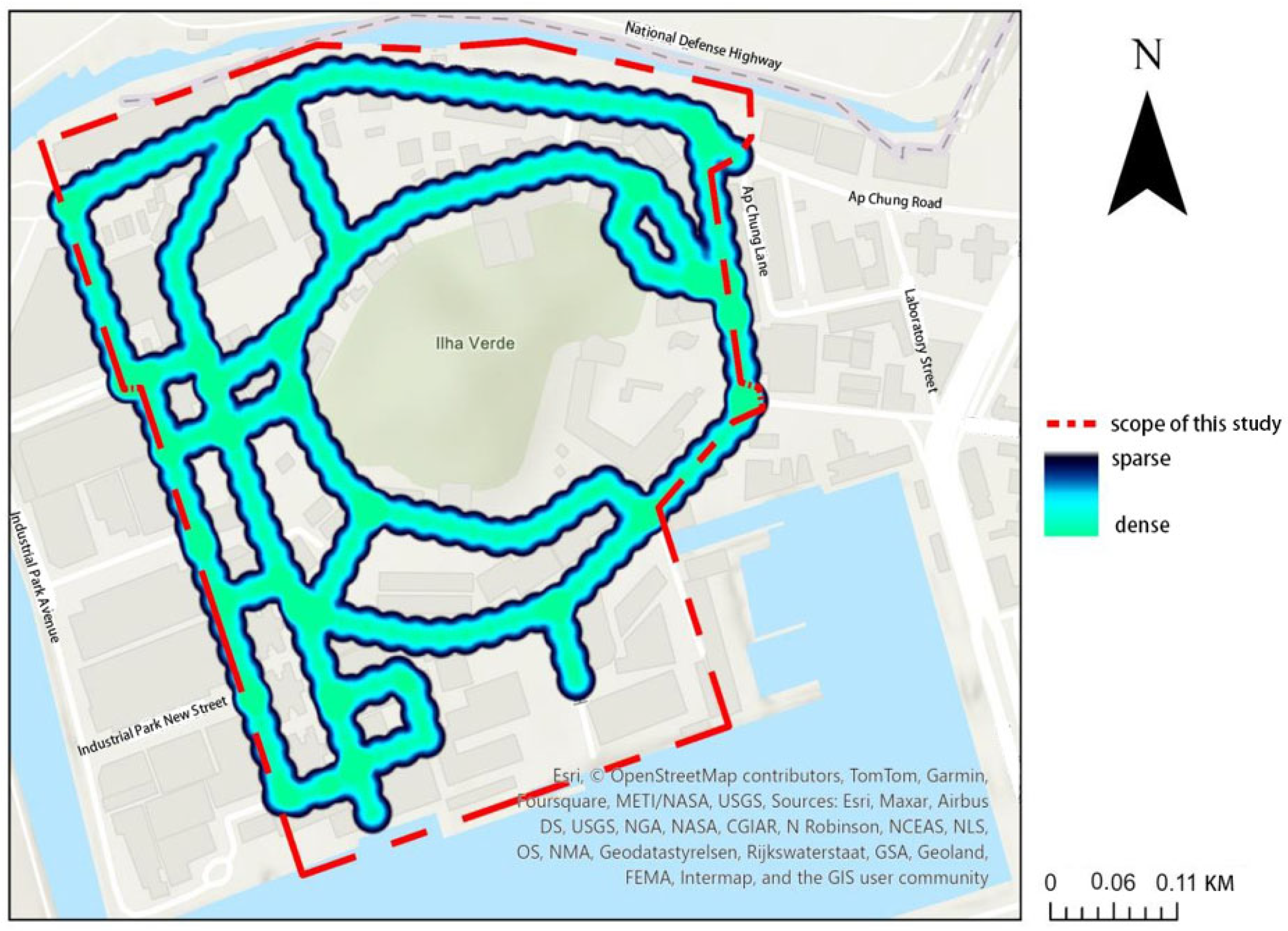 In this study, POI density is used as a proxy index for the service function of a place: the higher the density, the stronger the urban function agglomeration and spatial accessibility, thereby significantly improving its attractiveness to crowd-based activities. Lower density indicates sparse service functions and a lack of spatial vitality. This indicator provides a data-driven basis for analyzing the urban spatial structure and supports the functional assessment of the surrounding environment of industrial heritage areas. In this study, the kernel density analysis of the POIs in Qingzhou Mountain was carried out, and the degree of POI agglomeration in each region was compared to determine whether business distribution in the Qingzhou Mountain area was concentrated and whether the population activities were active. The POI data used in this study was downloaded from Baidu Maps, imported into ArcGIS and combined with the road network and building contours of Qingzhou Mountain to obtain the POI distribution map of Qingzhou Mountain (