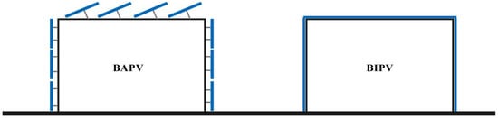 Unlike Building-Applied Photovoltaics (BAPV), BIPV (Figure 1) utilizes building roofs, facades, and other components to directly integrate PV modules as part of the building envelope, achieving efficient utilization of building exterior surfaces while converting solar energy into electrical energy through PV modules, realizing building “self-generation and self-consumption” []. Among these applications, BIPV facade applications have significant potential in curtain wall buildings and high-density urban spaces. However, BIPV building development faces numerous challenges, particularly thermal effects. Since building envelopes integrate PV modules—dark, heat-absorbing materials—the heat generation from PV modules directly affects both indoor and outdoor environments, especially during summer high-temperature weather.