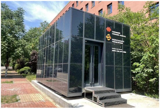 The measurement object is located within a university campus in Jinan, Shandong Province, China. It serves as an experimental platform jointly established by the National Energy Administration and the university. The experimental building is a regular single-story BIPV building with dimensions of 3.9 m in height, 6.6 m in length, and 4 m in width (Figure 2). As shown in Figure 2, the building’s south side is adjacent to a pedestrian crosswalk with a 2 m width and red permeable paving. During summer, the building’s north side is surrounded by trees and shrubs, with partial vegetation blocking on the east and west sides.