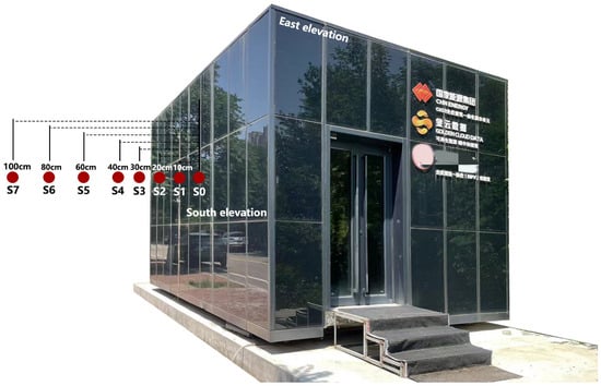 Outdoor parameter measurement includes outdoor environmental meteorological parameter collection and building external temperature data collection. Outdoor environmental meteorological parameters are collected through outdoor weather stations to understand climate characteristics of the building’s location environment. The collected environmental temperature, wind speed, and solar radiation are represented as T, V, and G, respectively. Outdoor temperature measurement uses temperature sensors on the south facade exterior, 2 m above ground level, with horizontal measurement points at distances of 10 cm, 20 cm, 30 cm, 40 cm, 60 cm, 80 cm, and 100 cm from the building exterior surface, named S1, S2, S3, S4, S5, S6, and S7, respectively, totaling 7 measurement points (Figure 5).