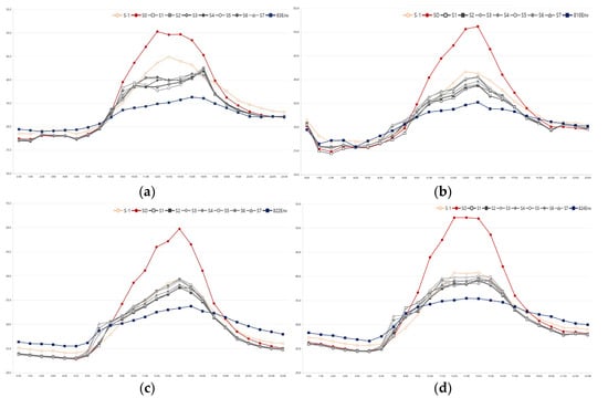 Temperature curves of a four high-temperature days: (a) August 3rd and (b) August 10th and (c) August 22nd and (d) August 24th.