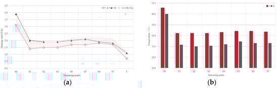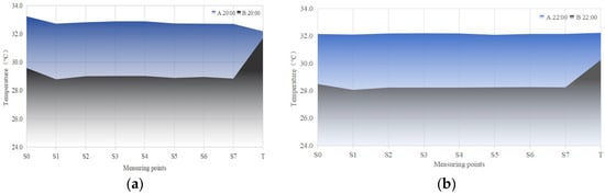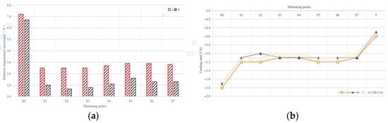 During the nighttime (20:00–06:00 next day), typical day A external measurement points showed nighttime average temperatures basically identical to the ambient air temperature, even producing weak heating effects. Typical day B demonstrated clear and stable cooling effects, with measurement points averaging 2.0~2.2 °C lower than the ambient temperature, as shown in Figure 10a. As shown in Figure 10b, since external measurement point cooling rates are generally within −0.15 °C/h after 22:00, temperature differences gradually decrease, and the temperature distribution becomes uniform, basically indicating that external thermal effects have dissipated.