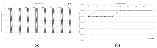 During nighttime periods (20:00–06:00), measurement point temperatures show differences from ambient temperatures ranging from −2.86 to 0.08 °C, with an average relative temperature increment of −1.52 °C, demonstrating overall cooling effects.
