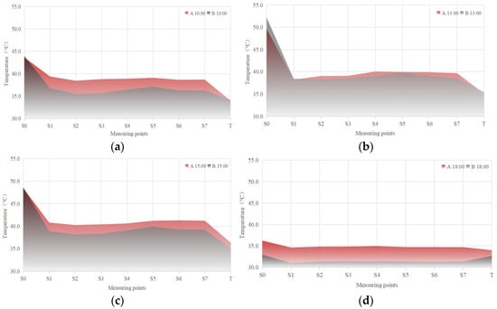 During the daytime, building surrounding ambient air is significantly heated above the environmental air temperature. Typical day A shows relative temperature increments of 2.5~2.9 °C in the 10–100 cm region, while typical day B shows relative temperature increments of 0.7~1.6 °C. Figure 7 shows important relationships between the two typical days. Both relative temperature increments and absolute temperatures were higher on day A than on day B. This indicates a strong correlation between the external air temperature and radiation intensity. The following analyzes daytime periods divided into three characteristic periods.