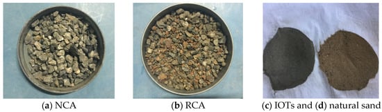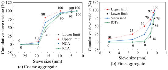 Sand was gathered from the Weihe River in Xi’an, Shaanxi Province, while IOTs were sourced from the YAOGOU tailings pond in Shangluo City, Shaanxi Province. Figure 2c,d illustrate the appearance of IOTs sand and natural sand. Both types of sand complied with the Chinese Standard for Technical Requirements and Test Method of Sand and Crushed Stone (or Gravel) for Ordinary Concrete (JGJ 52-2006) [38]. The particle size distribution is depicted in Figure 1b. Specifically, D10, D30, and D60 were 2.31 mm, 1.14 mm, and 0.58 mm, respectively, where D10, D30, and D60 represented the particle sizes when the cumulative particle size distribution reached 10%, 30%, and 60%, respectively. The nonuniformity coefficient (D60/D10) for natural sand was 0.25, and the curvature coefficient (D302/(D10D60)) was 0.97. Compared to natural sand, the surface of IOTs sand was rough and exhibited more angular particles with numerous edges and corners, thereby reducing the fluidity of the test specimen. Therefore, a water-reducing agent was added.