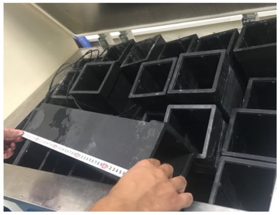 Concrete with a curing age of 28 days and a size of 100 mm × 100 mm × 300 mm was used for the test. The concrete specimen was placed into a rubber test piece box with the dimensions 115 mm × 115 mm × 500 mm, as illustrated in Figure 4. A 20 mm gap was maintained between the specimen boxes to ensure an unobstructed flow of antifreeze within the tank. Distilled water was added to the specimen box until the water level was approximately 20 mm above the top surface of the concrete specimen. A temperature sensor placed at the center controlled the temperature of the concrete specimen. Throughout each freeze–thaw cycle, the specimen was cooled from 5 °C to −20 °C over a period of 3 h. Then, the concrete specimen was thawed to 5 °C within 1 h, with a temperature error of ±2 °C.