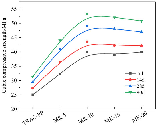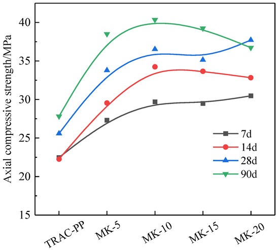 It can be seen from Figure 7 that the strength of concrete shows an obvious upward trend with the increase in MK content. As the content of MK increased, the strength of the concrete was significantly enhanced. The axial compressive strength of MK concrete consistently surpassed that of TRAC-PP. Notably, the 7-day strength of concrete containing 5% MK was equivalent to the 90-day strength of TRAC-PP. Furthermore, the 7-day strength of concrete incorporating 10%, 15%, and 20% MK was greater than that of concrete without MK. These results indicated that MK significantly influenced early strength development, primarily through its rapid pozzolanic reaction, which accelerated the early strength gain of concrete. Additionally, the finer particle size of MK compared to cement and sand contributed to improved internal porosity.